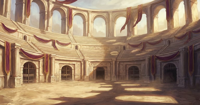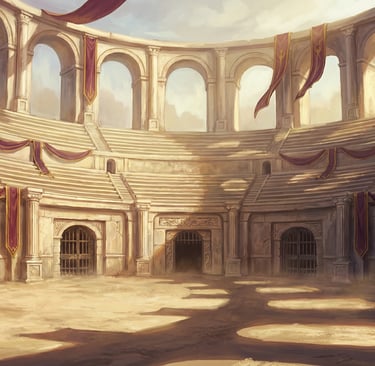 A Arena Real é o palco onde força, prestígio e espetáculo se encontram. Construída em mármore do Vale Cinzento, suas arquibancadas refletem a rígida divisão social do Reino, enquanto fossos subterrâneos ocultam perigos que poucos ousam enfrentar.