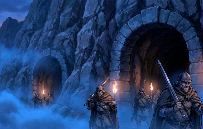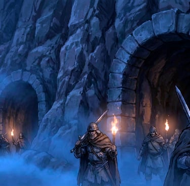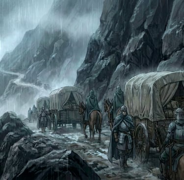 Trilhas estreitas cortam as montanhas, ligando minas, vilas e o Vale Cinzento. Cada caravana carrega riqueza… e o risco de jamais retornar.
