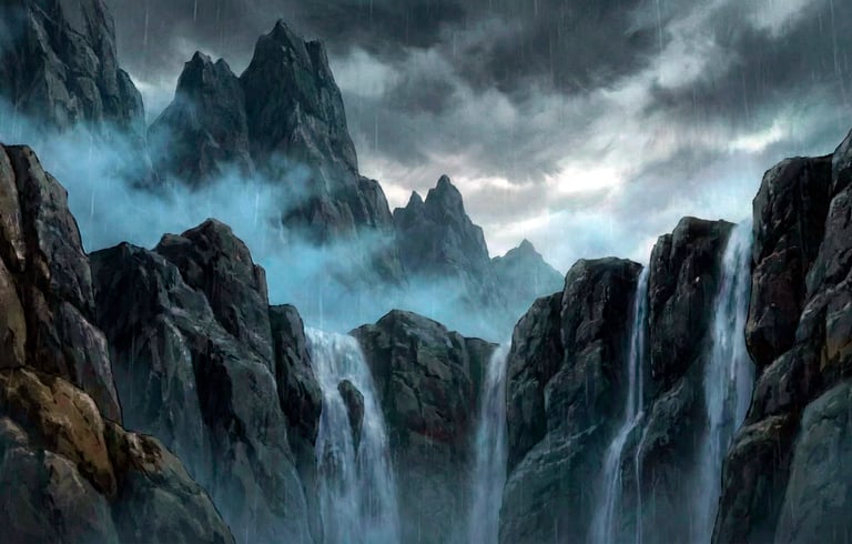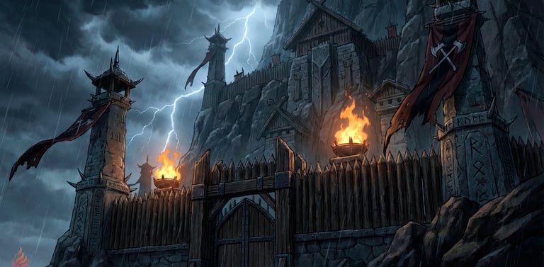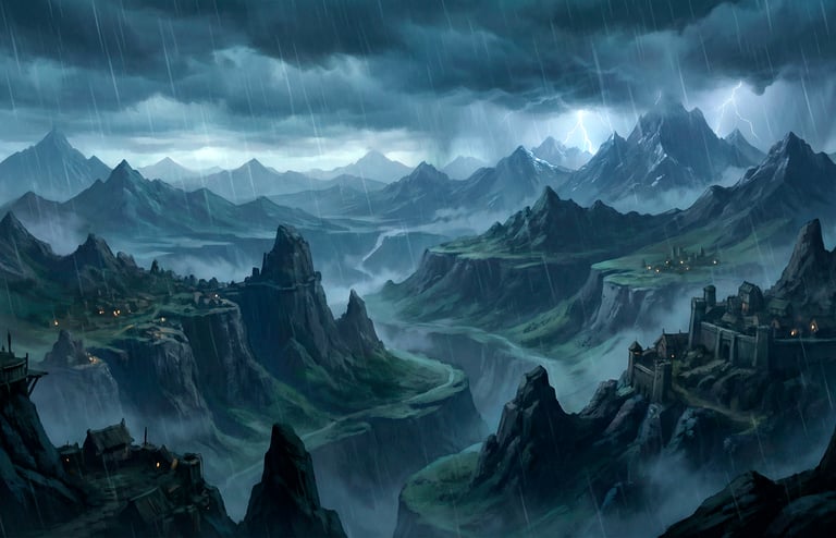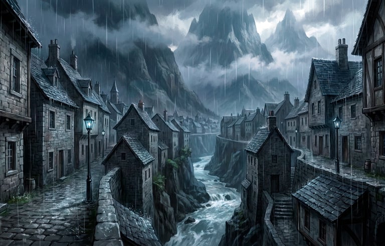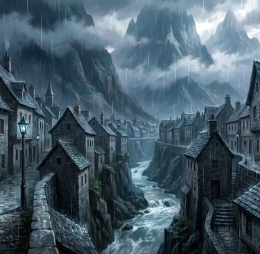 Encravado entre montanhas colossais, o Vale Cinzento é uma cidade forjada na adversidade. Suas ruas de pedra, constantemente banhadas pela chuva, ecoam o som do trabalho duro e da sobrevivência.