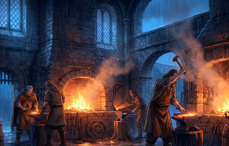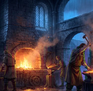 O coração do Vale pulsa nas forjas. Martelos, bigornas e fogo transformam minério bruto em armas e armaduras lendárias, cobiçadas por exércitos e aventureiros de todo o continente.